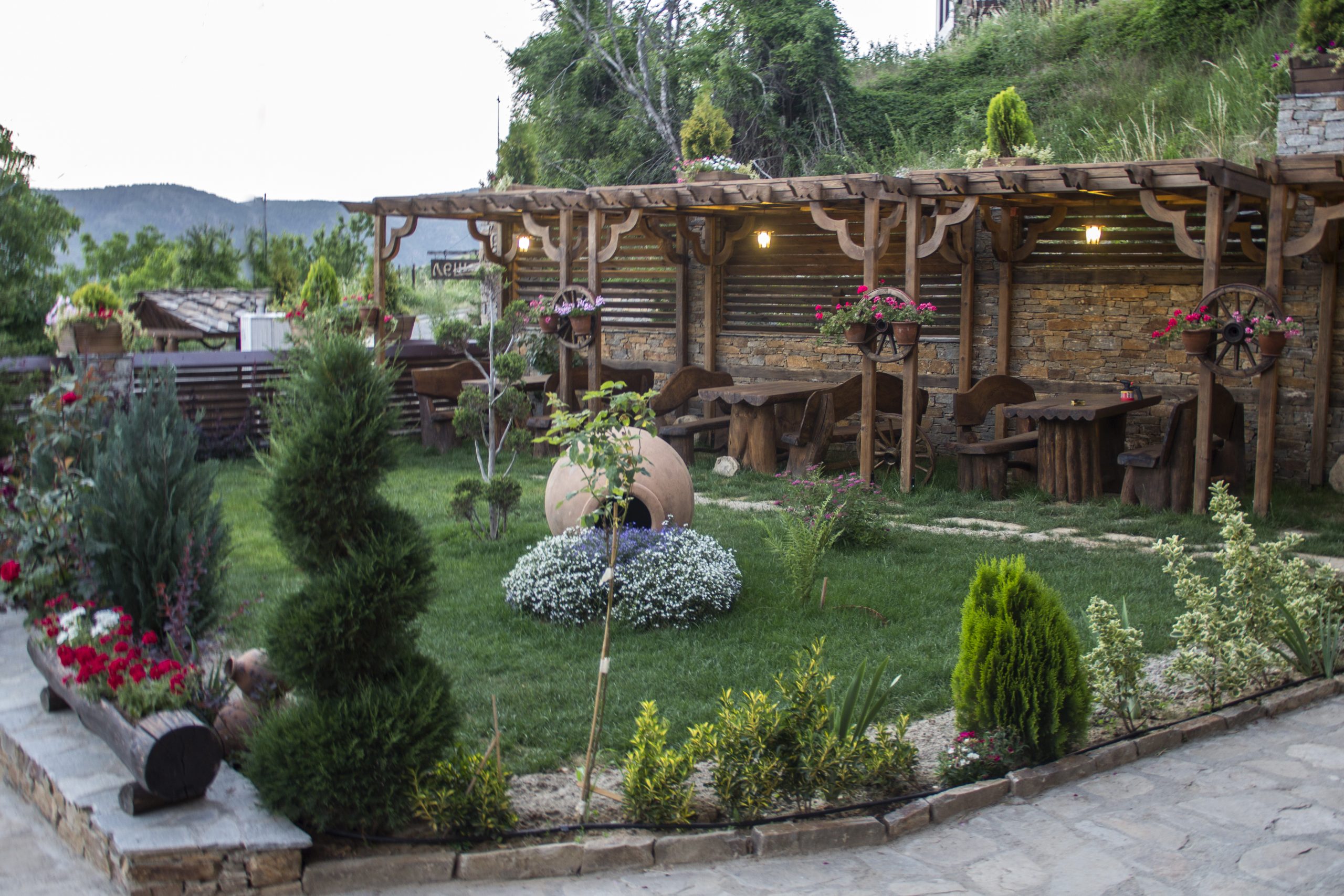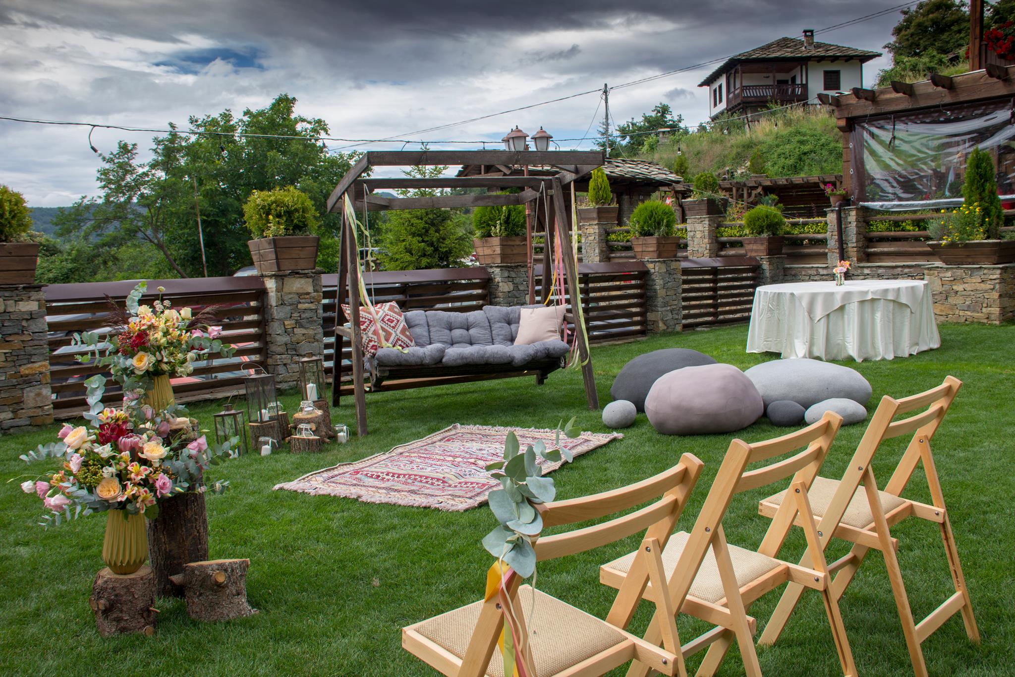 Механата на къща за гости Родопски Кът разполага с 80 места в основната си зала, както и допълнителни места в лятната градина под навеса, откъдето пред очите ви се открива гледка, която думите не могат да опишат. Гледка, която ви носи една истинска емоция, кара ви да се вълнувате, защото там горе усещате величието на природата…